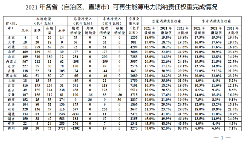 國家能源局今天發(fā)布關(guān)于2021年可再生能源電力消納責任權(quán)重完成情況的通報。