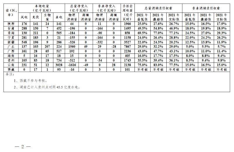 綜合考慮各省(自治區(qū)、直轄市)本地生產(chǎn)和利用、外來電力消納、超額消納量交易等情況,29個省份完成了704號文明確的最低非水可再生能源電力消納責任權(quán)重,其中19個省(自治區(qū)、直轄市)達到激勵值;新疆未完成最低可再生能源電力非水消納責任權(quán)重,相差0.6個百分點。2021年各省(自治區(qū)、直轄市)可再生能源電力非水消納責任權(quán)重完成情況見附件。