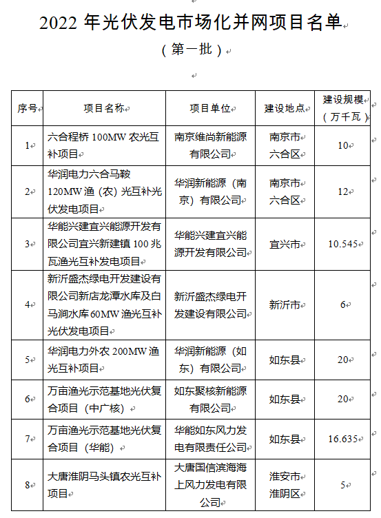 5月11日,江蘇發(fā)改委公布了2022年光伏發(fā)電市場化并網(wǎng)項目名單(第一批)。共計18個項目,總規(guī)模1.62GW。通知要求,各設(shè)區(qū)市發(fā)展改革委進(jìn)一步提高思想認(rèn)識,堅決貫徹落實黨中央、國務(wù)院決策部署,加大電力基礎(chǔ)設(shè)施投資力度,督促指導(dǎo)項目單位辦理相關(guān)手續(xù),抓緊委托開展接入系統(tǒng)設(shè)計,在依法合規(guī)的前提下盡快開工建