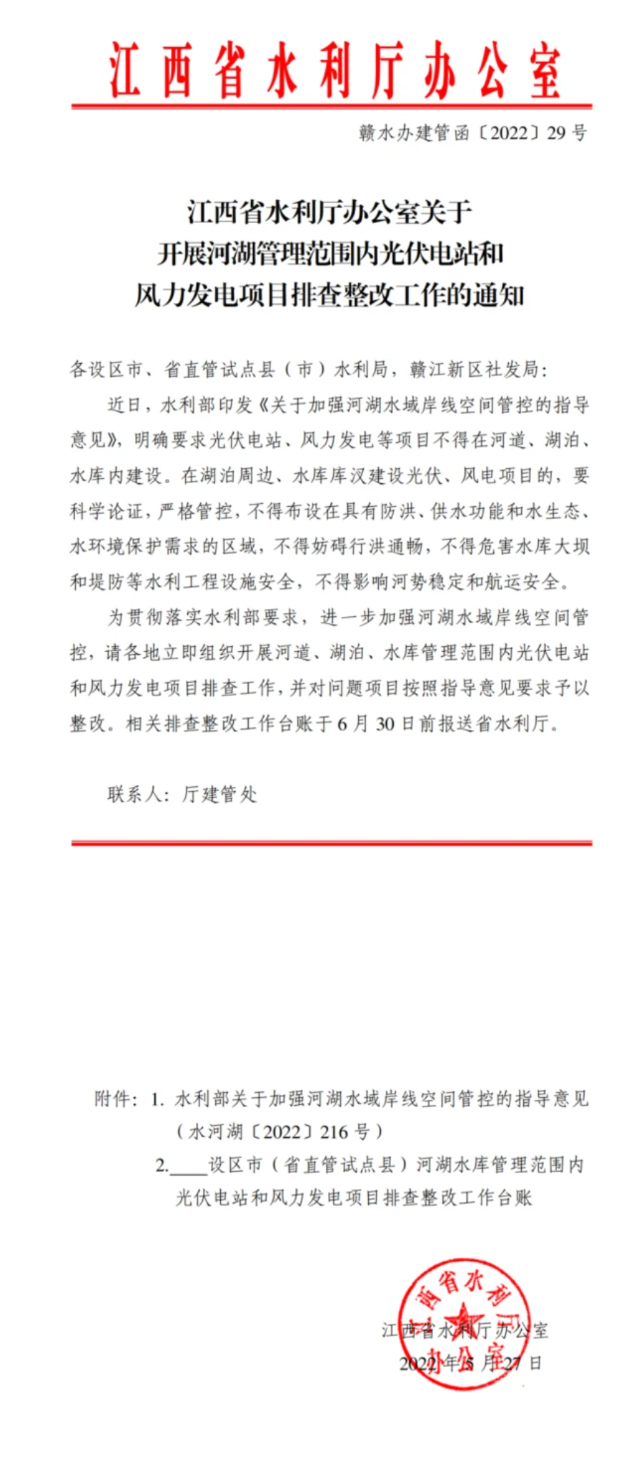 5月27日,江西省水利廳辦公室下發(fā)《關(guān)于開(kāi)展河湖管理范圍內(nèi)光伏電站和風(fēng)力發(fā)電項(xiàng)目排查整改工作的通知》,要求貫徹落實(shí)水利部指導(dǎo)意見(jiàn), 進(jìn)一步加強(qiáng)河湖水域岸線空間管控,立即組織開(kāi)展河道、湖泊、水庫(kù)管理范圍內(nèi)光伏電站和風(fēng)力發(fā)電項(xiàng)目排查工作,并對(duì)問(wèn)題項(xiàng)目按照指導(dǎo)意見(jiàn)要求予以整改相關(guān)排查整改工作臺(tái)賬。