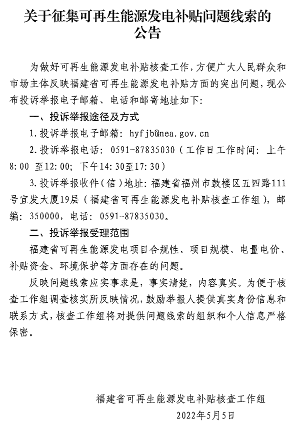 從國(guó)家能源局福建省能源監(jiān)管辦獲悉,5月27日,福建省可再生能源發(fā)電補(bǔ)貼核查工作組發(fā)布關(guān)于征集可再生能源發(fā)電補(bǔ)貼問題線索的公告,為做i好可再生能源發(fā)電補(bǔ)貼核查工作,方便廣大群眾喝市場(chǎng)主體反映福建省可再生能源發(fā)電補(bǔ)貼方面的突出問題,公布了投訴舉報(bào)受理范圍,投訴舉報(bào)途徑及方式。