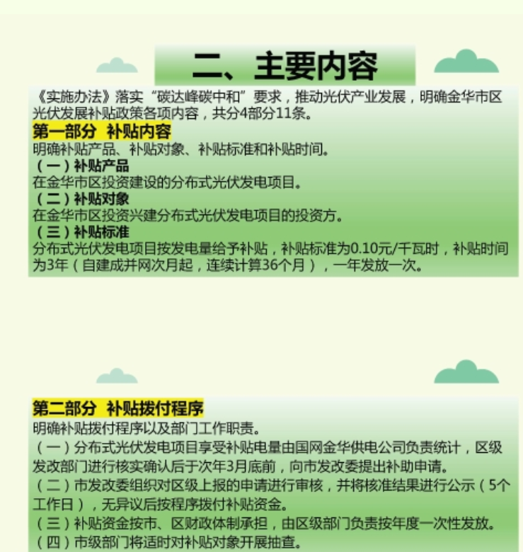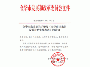 金華市發(fā)改委今日印發(fā)《金華市區(qū)光伏發(fā)展補貼實施辦法》,其中明確,對在金華市區(qū)投資興建分布式光伏發(fā)電項目的投資方,分布式光伏發(fā)電項目按發(fā)電量給予補貼,補貼標準為0.10元/千瓦時,補貼時間為3年(自建成并網(wǎng)次月起,連續(xù)計算36個月),一年發(fā)放一次。本辦法自2022年度起適用。