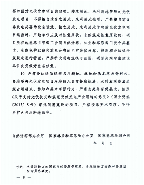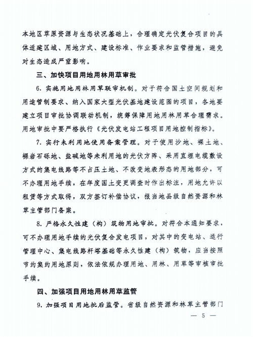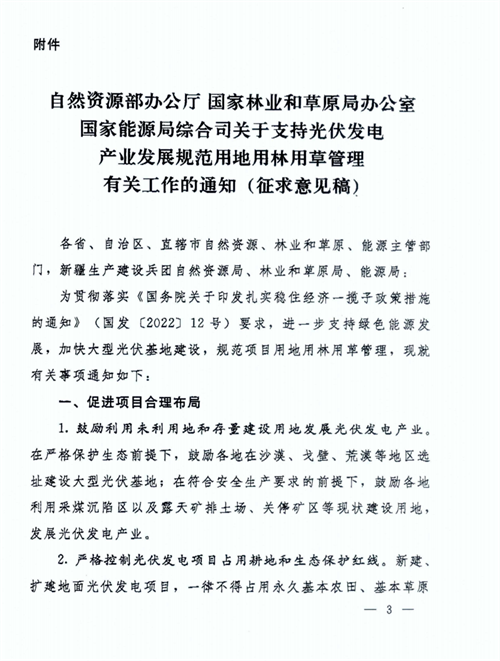 自然資源部辦公廳、國(guó)家林業(yè)和草原局辦公室、國(guó)家能源局綜合司近日聯(lián)合印發(fā)的《關(guān)于支持光伏發(fā)電產(chǎn)業(yè)發(fā)展規(guī)范用地用林用草管理有關(guān)工作的通知》(征求意見稿)提出,對(duì)于利用農(nóng)用地建設(shè)復(fù)合光伏項(xiàng)目的,不得占用耕地和林地。對(duì)于使用農(nóng)用地的,其面積不超過項(xiàng)目總用地面積50%的情況下,光伏方陣、采用直埋電纜敷設(shè)方式的集電線路可不