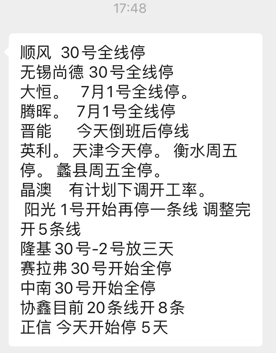 今天,一份涉及多家光伏組件廠的停產(chǎn)時(shí)間表在業(yè)內(nèi)流傳(如下圖):從表中看,多數(shù)企業(yè)停產(chǎn)或減產(chǎn)行為均集中6月底至7月初這幾天,時(shí)間很一致。這不得不讓人想到前兩天兩大硅片龍頭中環(huán)和隆基接連宣布硅片漲價(jià)的背景。