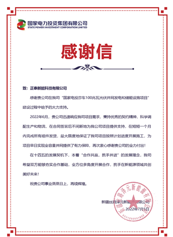 國(guó)家電投集團(tuán)子公司新疆絲路澤元新能源有限公司項(xiàng)目負(fù)責(zé)人表示,正泰新能迅速響應(yīng)項(xiàng)目需求,秉持優(yōu)秀的契約精神,科學(xué)調(diào)配生產(chǎn)和物流,在合同簽署后不間斷地為項(xiàng)目提供支持,在短短一個(gè)月內(nèi)完成所有組件發(fā)貨,最大限度地保證了項(xiàng)目按照計(jì)劃進(jìn)度開(kāi)展施工,為項(xiàng)目早日實(shí)現(xiàn)全容量并網(wǎng)提供了有力保障。