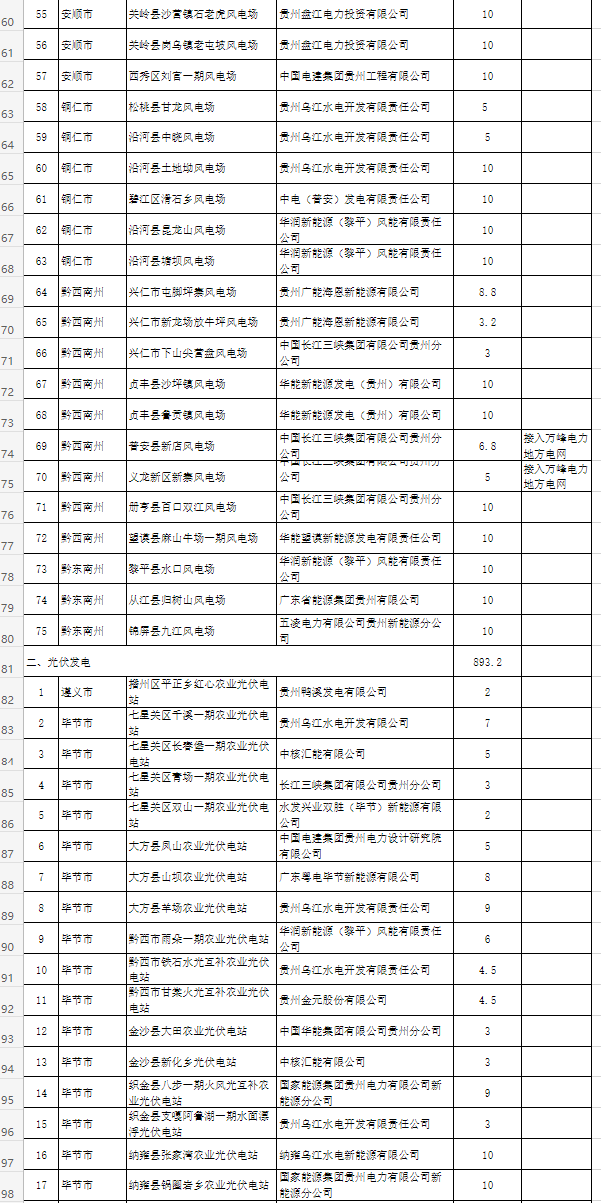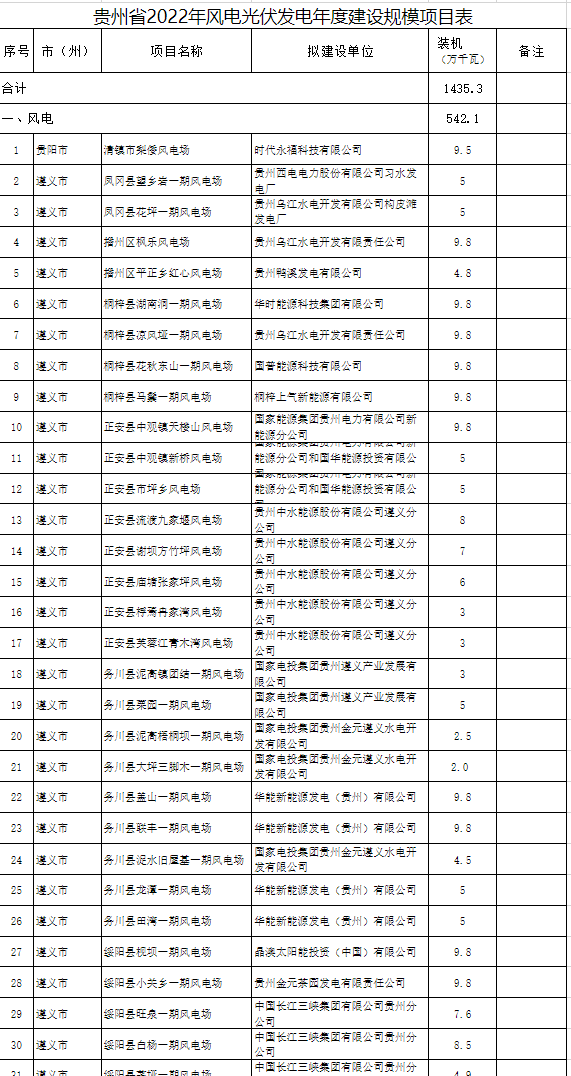 貴州省2022年風(fēng)電光伏發(fā)電年度建設(shè)規(guī)模項(xiàng)目表如下: