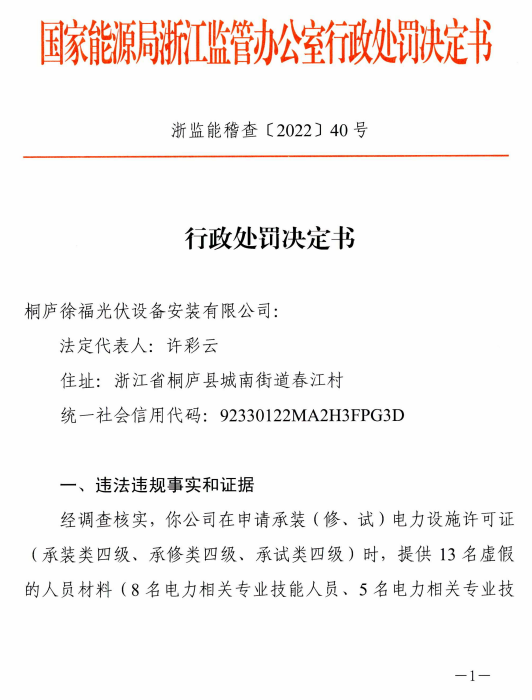 日前,浙江能源監(jiān)管局下發(fā)行政處罰決定書,對(duì)桐廬徐福光伏公司在申請(qǐng)承裝電力設(shè)施許可證時(shí)提供虛假人員材料的違法違規(guī)行為給予警告和罰款三萬元。