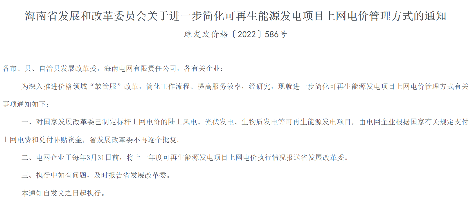 7月18日,海南省發(fā)展和改革委員會發(fā)布關(guān)于進(jìn)一步簡化可再生能源發(fā)電項(xiàng)目上網(wǎng)電價(jià)管理方式的通知,即日起,對國家發(fā)展改革委已制定標(biāo)桿上網(wǎng)電價(jià)的陸上風(fēng)電、光伏發(fā)電、生物質(zhì)發(fā)電等可再生能源發(fā)電項(xiàng)目,由電網(wǎng)企業(yè)根據(jù)國家有關(guān)規(guī)定支付上網(wǎng)電費(fèi)和兌付補(bǔ)貼資金,省發(fā)展改革委不再逐個(gè)批復(fù)。