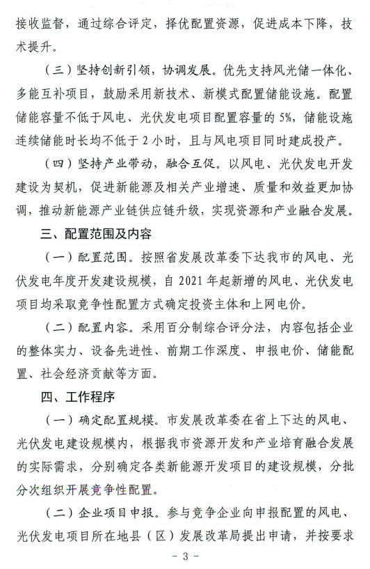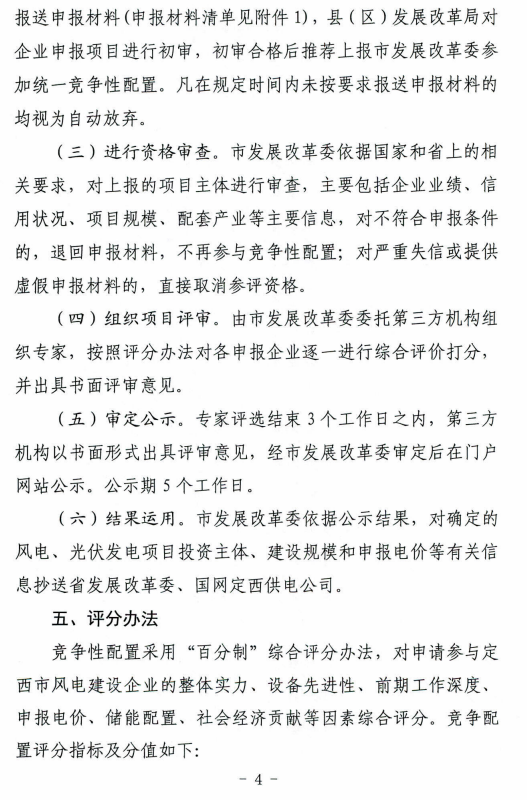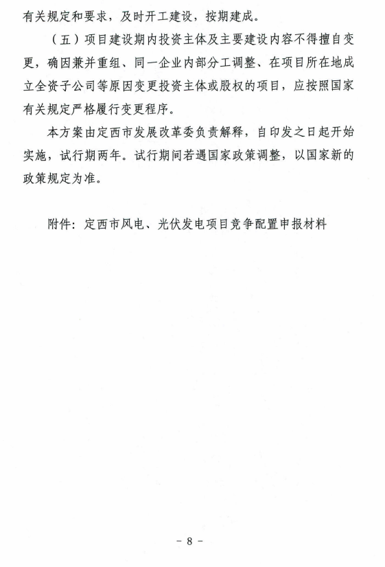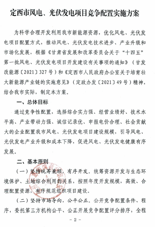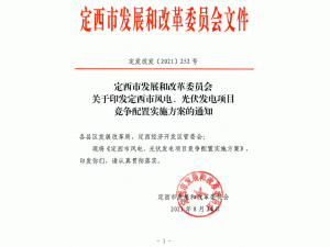 日前,根據(jù)《定西市發(fā)展和改革委員會關于印發(fā)定西市風電、光伏發(fā)電項目競爭配置實施方案的通知》,定西市安定區(qū)5萬千瓦集中式光伏發(fā)電項目進行公開競爭配置,要求單個風電、光伏發(fā)電項目規(guī)模不低于5萬千瓦(含)不超過10萬千瓦(含),申報一個發(fā)電項目需配套落戶一項產業(yè)。優(yōu)先支持風光儲一體化、多能互補項目鼓勵采用新技術、新模式配置儲能設施。必須于當年開工建設、2022年底前全容量建成投產。