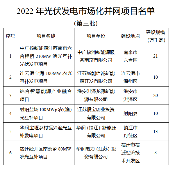 7月22日,江蘇省發(fā)改委公布2022年光伏發(fā)電市場(chǎng)化并網(wǎng)項(xiàng)目(第三批)名單,6個(gè)光伏項(xiàng)目入選,規(guī)模820MW。