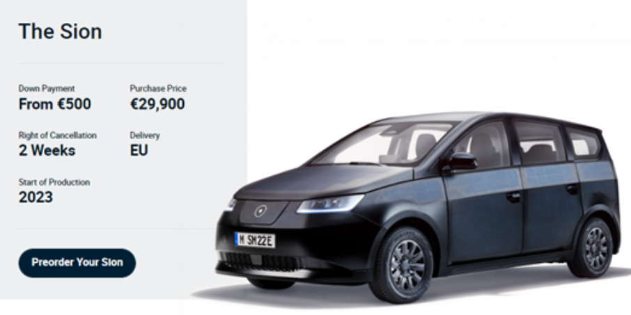 SonoMotors宣稱,目前該太陽能車已接到超過2萬臺(tái)的訂單,訂金為500歐元/臺(tái),預(yù)計(jì)正式售價(jià)為29900歐元/臺(tái)(約人民