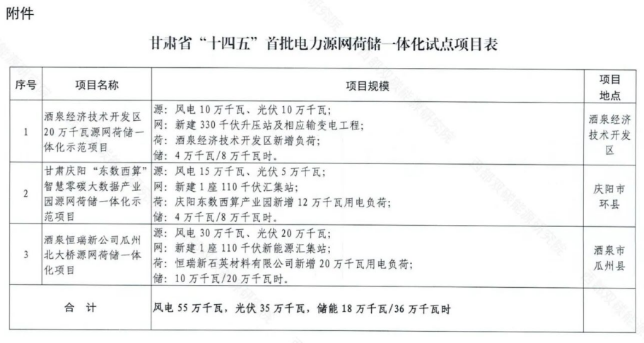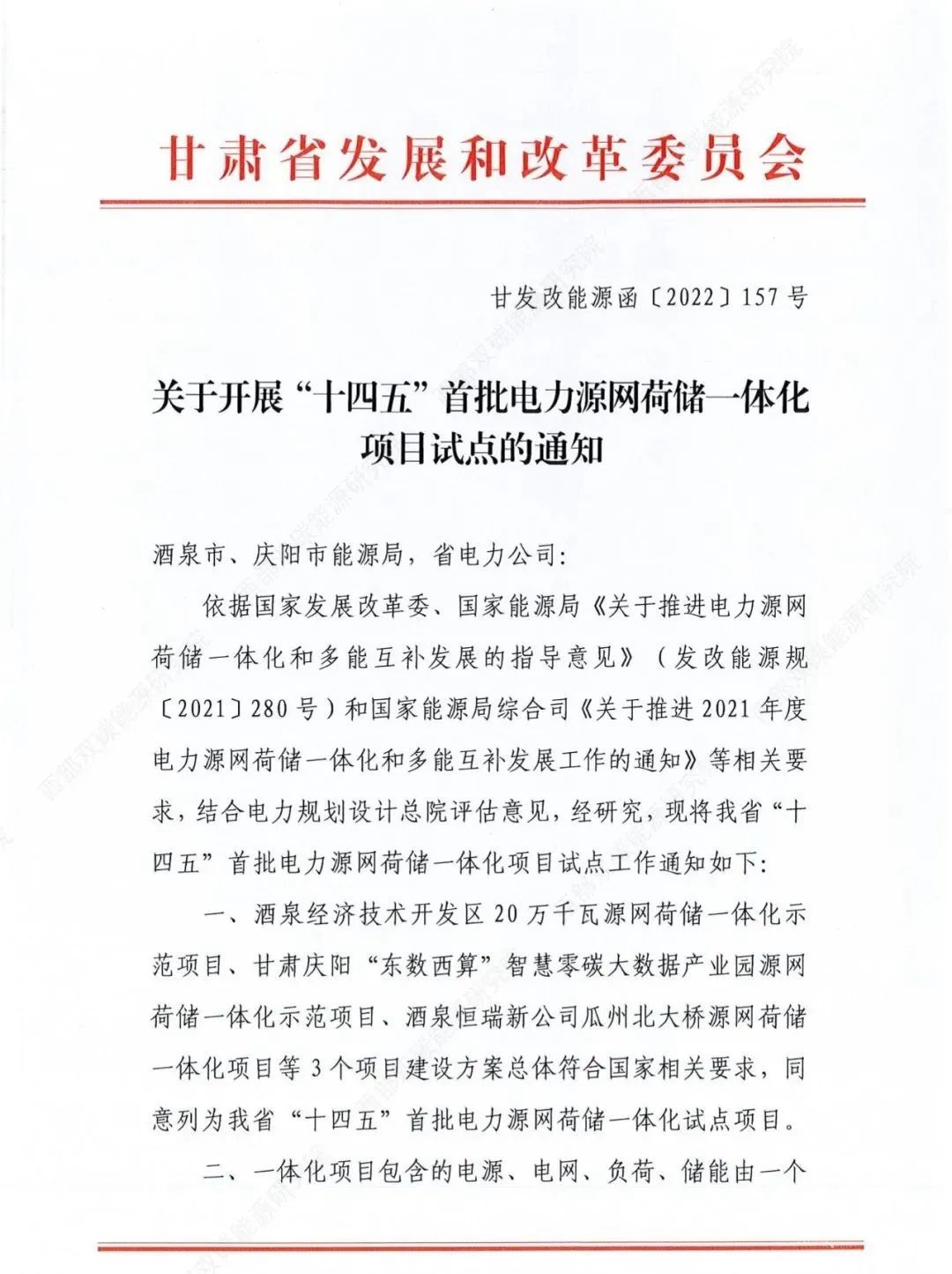 9月9日,甘肅省發(fā)改委印發(fā)《關于開展“十四五”首批電力源網荷儲一體化項目試點的通知》,酒泉經濟技術開發(fā)區(qū)20萬千瓦、甘肅慶陽“東數西算”智慧零碳大數據產業(yè)園、酒泉恒瑞新公司瓜州北大橋等3個項目建設方案,列為“十四五”首批電力源網荷儲一體化試點項目。其中風電55萬千瓦,光伏35萬千瓦,儲能18萬千瓦/36萬千瓦時。
