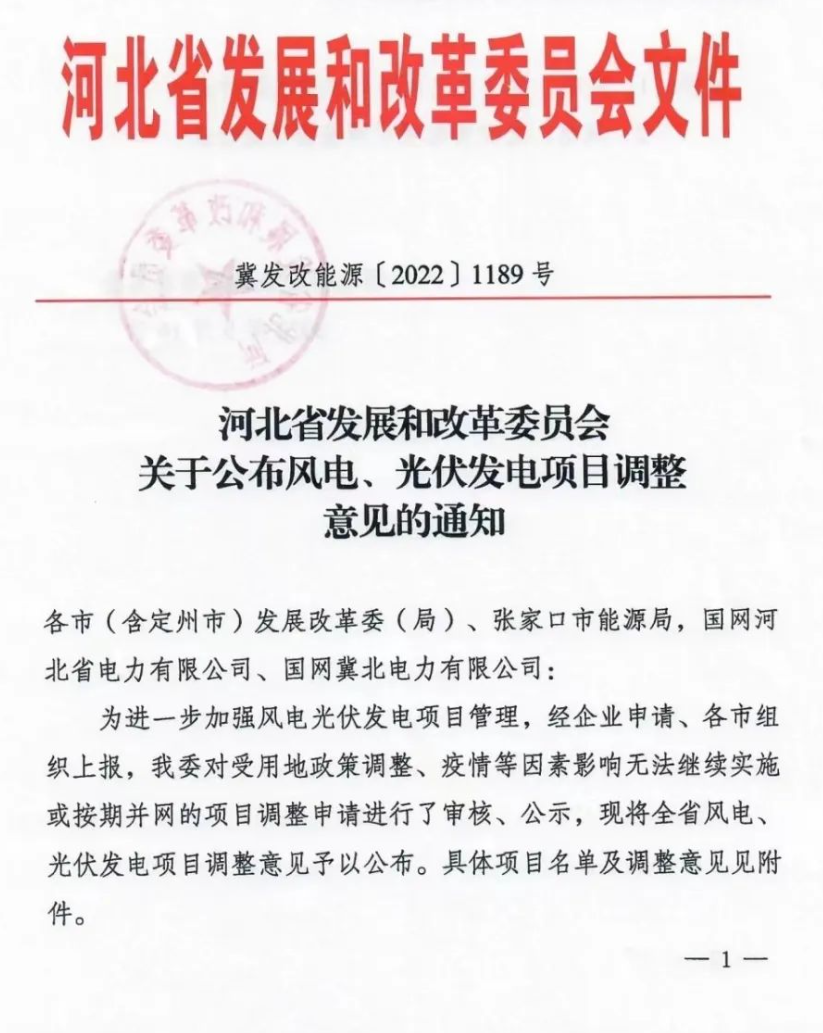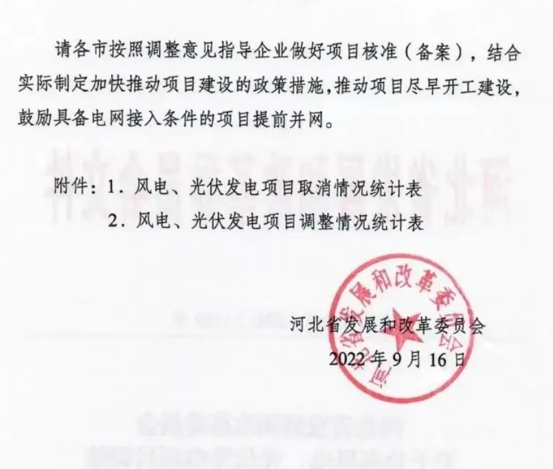 9月16日,河北發(fā)改委正式印發(fā)《關(guān)于公布風(fēng)電、光伏發(fā)電項(xiàng)目調(diào)整意見(jiàn)的通知》,對(duì)受用地政策調(diào)整、疫情等因素影響無(wú)法繼續(xù)實(shí)施或按期并網(wǎng)的項(xiàng)目進(jìn)行了調(diào)整,光伏新增取消三個(gè)2021年光伏保障性項(xiàng)目指標(biāo),規(guī)?傆(jì)為350MW。9月8日,河北省發(fā)改委公示了 2022年度風(fēng)電、光伏開(kāi)發(fā)建設(shè)規(guī)模匯總表。根據(jù)公示的2022年風(fēng)光開(kāi)發(fā)建