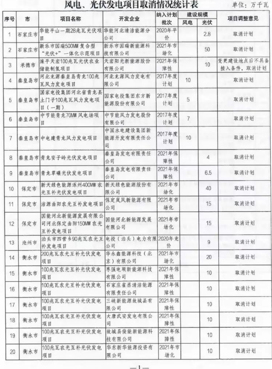 9月16日,河北發(fā)改委正式印發(fā)《關(guān)于公布風(fēng)電、光伏發(fā)電項(xiàng)目調(diào)整意見(jiàn)的通知》,對(duì)受用地政策調(diào)整、疫情等因素影響無(wú)法繼續(xù)實(shí)施或按期并網(wǎng)的項(xiàng)目進(jìn)行了調(diào)整,光伏新增取消三個(gè)2021年光伏保障性項(xiàng)目指標(biāo),規(guī)模總計(jì)為350MW。