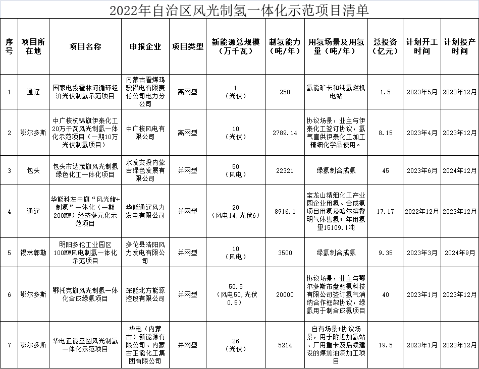 為深入貫徹習(xí)近平總書記關(guān)于內(nèi)蒙古系列重要指示精神和《內(nèi)蒙古自治區(qū)人民政府辦公廳關(guān)于促進(jìn)氫能產(chǎn)業(yè)高質(zhì)量發(fā)展的意見》(內(nèi)政辦發(fā)〔2022〕15號(hào))精神,有序推動(dòng)全區(qū)風(fēng)光制氫一體化示范項(xiàng)目建設(shè),按照《內(nèi)蒙古自治區(qū)風(fēng)光制氫一體化示范項(xiàng)目實(shí)施細(xì)則(2022年版)》有關(guān)要求,我局組織評(píng)估并優(yōu)選了7個(gè)風(fēng)光制氫一體化示范項(xiàng)目(以下簡(jiǎn)稱“示范項(xiàng)目”),經(jīng)自治區(qū)人民政府審定同意批復(fù)實(shí)施,F(xiàn)將有關(guān)事宜通知如下。