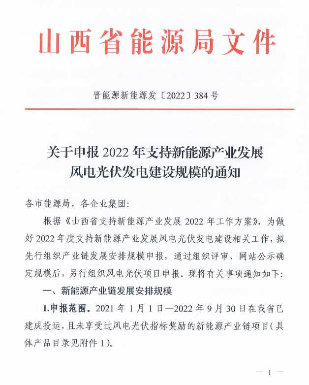 10月13日,山西省能源局印發(fā)《關于申報2022年支持新能源產(chǎn)業(yè)發(fā)展風電光伏發(fā)電建設規(guī)模的通知》,擬先行組織產(chǎn)業(yè)鏈發(fā)展安排規(guī)模申報。申報范圍為2021年1月1日-2022年9月30日在山西省已建成投運,且未享受過風電光伏指標獎勵的新能源產(chǎn)業(yè)鏈項目。