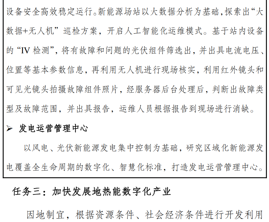《規(guī)劃》在新能源領(lǐng)域提出了5個(gè)主要任務(wù)。一是建設(shè)一批智慧場(chǎng)站。二是推進(jìn)大數(shù)據(jù)與清潔能源發(fā)展深度融合。三是加快發(fā)展地?zé)崮軘?shù)字化產(chǎn)業(yè)。四是打造新能源數(shù)字化平臺(tái)。五是發(fā)展新能源產(chǎn)業(yè)新模式,持續(xù)優(yōu)化能源結(jié)構(gòu)。