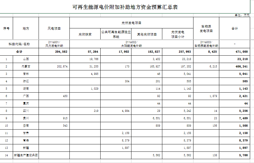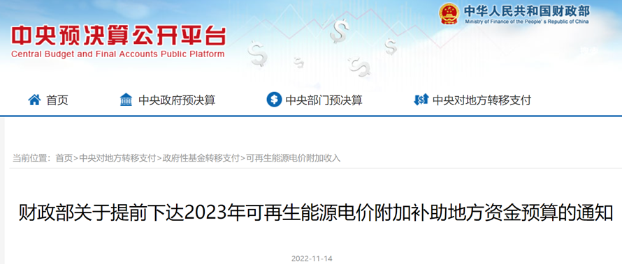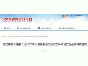 14日從中央預(yù)決算公開平臺獲悉:根據(jù)財政部下發(fā)的關(guān)于提前下達(dá)2023年可再生能源電價附加補(bǔ)助地方資金預(yù)算的通知,風(fēng)電20.46億元, 光伏25.8億元,生物質(zhì)8425萬元,合計47.1億x