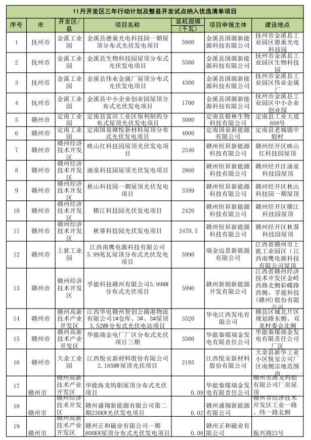 根據(jù)《江西省整體推進(jìn)開(kāi)發(fā)區(qū)屋頂光伏建設(shè)三年行動(dòng)計(jì)劃(2022-2024年)》與《江西省能源局關(guān)于進(jìn)一步做好整縣屋頂分布式光伏開(kāi)發(fā)試點(diǎn)工作的通知》要求,江西省能源局組織開(kāi)展了開(kāi)發(fā)區(qū)三年行動(dòng)計(jì)劃及整縣開(kāi)發(fā)試點(diǎn)項(xiàng)目10月競(jìng)爭(zhēng)性優(yōu)選工作,江西省可再生能源信息中心對(duì)項(xiàng)目材料進(jìn)行合規(guī)性審查,經(jīng)省能源局同意,現(xiàn)將優(yōu)選結(jié)果予以