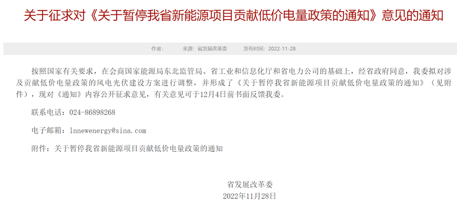從遼寧省發(fā)改委獲悉:11月28日,遼寧省發(fā)改委發(fā)布關(guān)于征求對《關(guān)于暫停我省新能源項目貢獻(xiàn)低價電量政策的通知》意見的通知,通知指出,為了落實(shí)好國家政策,同時促進(jìn)我省新能源健康快速發(fā)展,保持政策連續(xù)性,經(jīng)會商省工信廳、國家能源局東北監(jiān)管局和省電力公司,并經(jīng)省政府同意,擬對涉及貢獻(xiàn)低價電量政策的風(fēng) 電光伏建設(shè)