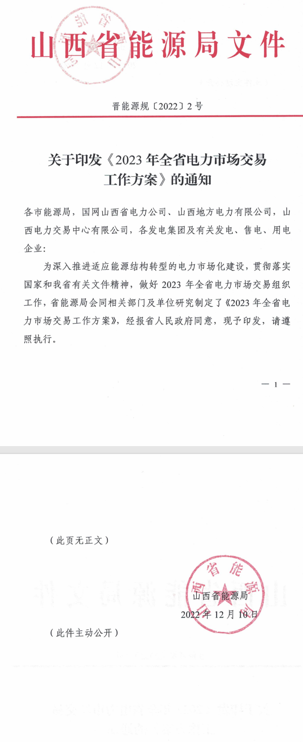 12月13日,山西省能源局印發(fā)2023 年全省電力市場(chǎng)交易工作方案。根據(jù)方案,2023 年,繼續(xù)開(kāi)展現(xiàn)貨市場(chǎng)連續(xù)結(jié)算試運(yùn)行,除居民、農(nóng)業(yè)用電外,全省工商業(yè)用電全部參與電力市場(chǎng)交易,交易規(guī)模預(yù)計(jì)在 1600 億千瓦時(shí)以上。