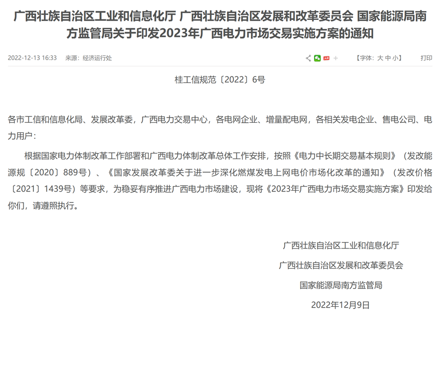 近日,廣西自治區(qū)工信廳等三部門(mén)聯(lián)合印發(fā)關(guān)于2023年廣西電力市場(chǎng)交易實(shí)施方案的通知。根據(jù)通知,