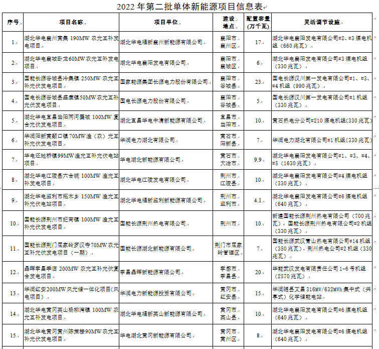 之前,湖北省能源局公布了2022年第二批納入建設(shè)規(guī)模管理的新能源發(fā)電項(xiàng)目名單。此次公布的7個(gè)風(fēng)光火儲(chǔ)新能源百萬(wàn)千瓦基地(二期)項(xiàng)目共計(jì)15個(gè),容量195萬(wàn)千瓦,其中:風(fēng)電項(xiàng)目6個(gè)、容量88萬(wàn)千瓦;光伏發(fā)電項(xiàng)目9個(gè)、容量107萬(wàn)千瓦。常規(guī)單體風(fēng)電和光伏發(fā)電項(xiàng)目共計(jì)20個(gè),容量232萬(wàn)千瓦。其中:風(fēng)電項(xiàng)目3個(gè)、容量45萬(wàn)千瓦;光伏發(fā)電項(xiàng)目17個(gè)、容量187萬(wàn)千瓦。風(fēng)電項(xiàng)目應(yīng)在2024年底前全容量并網(wǎng)發(fā)電,光伏項(xiàng)目應(yīng)在2024年6月底前全容量并網(wǎng)發(fā)電。