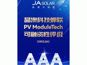 近日,PV ModuleTech發(fā)布2022年第四季度組件可融資性評級。晶澳科技憑借在出貨、產(chǎn)能布局、技術(shù)布局、財務(wù)表現(xiàn)等指標(biāo)的出色表現(xiàn),以及在生產(chǎn)制造、財務(wù)狀況等方面表現(xiàn)出的綜合優(yōu)勢,再次獲得最高AAA評級。