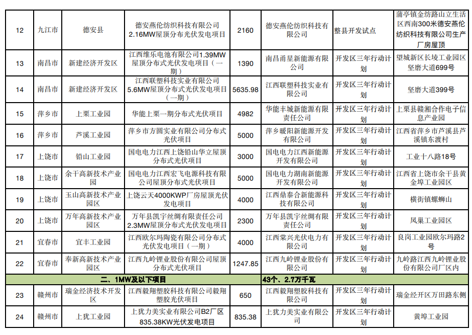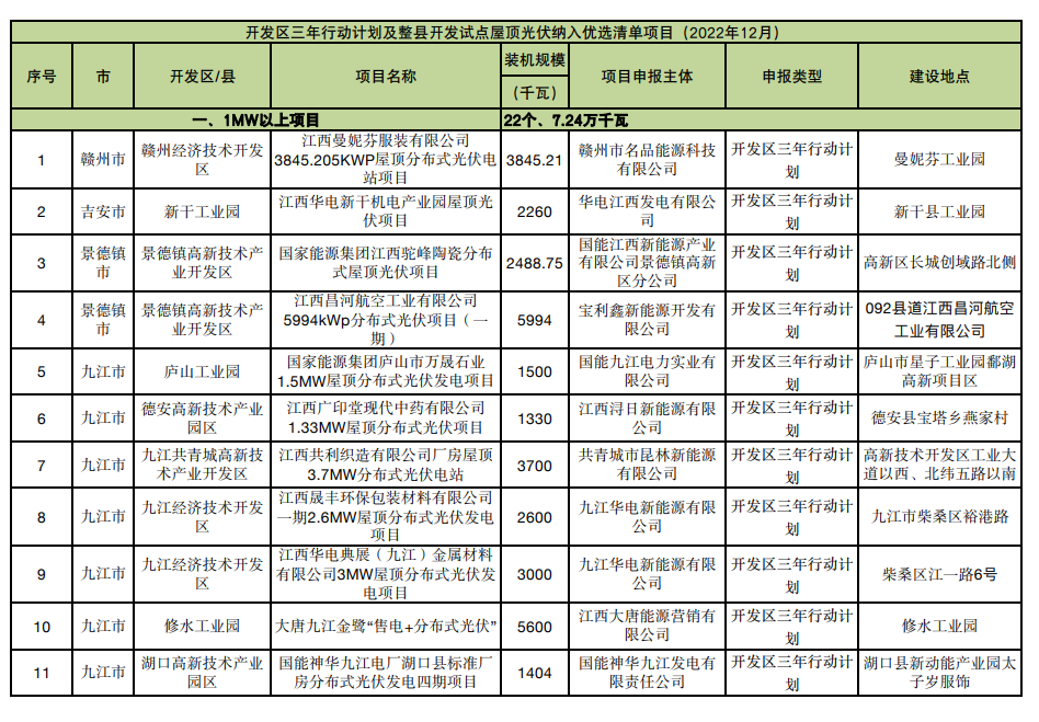 1月5日,江西省可再生能源中心發(fā)布了《開發(fā)區(qū)三年行動(dòng)計(jì)劃及整縣開發(fā)試點(diǎn)項(xiàng)目2022年12月競(jìng)爭(zhēng)性優(yōu)選結(jié)果》,總規(guī)模99.4MW。據(jù)《江西省整體推進(jìn)開發(fā)區(qū)屋頂光伏建設(shè)三年行動(dòng)計(jì)劃(2022-2024年)》與《江西省能源局關(guān)于進(jìn)一步做好整縣屋頂分布式光伏開發(fā)試點(diǎn)工作的通知》要求,江西省能源局組織開展了開發(fā)區(qū)三年行