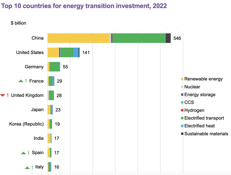 2022年能源轉(zhuǎn)型投資排名前10的國(guó)家,中國(guó)大幅領(lǐng)先,占全球投資總額近半