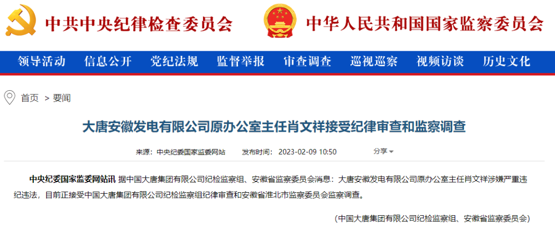 據(jù)中國大唐集團有限公司紀檢監(jiān)察組、安徽省監(jiān)察委員會消息:大唐安徽發(fā)電有限公司原辦公室主任肖文祥涉嫌嚴重違紀違法,目前正接受中國大唐集團有限公司紀檢監(jiān)察組紀律審查和安徽省淮北市監(jiān)察委員會監(jiān)察調(diào)查。