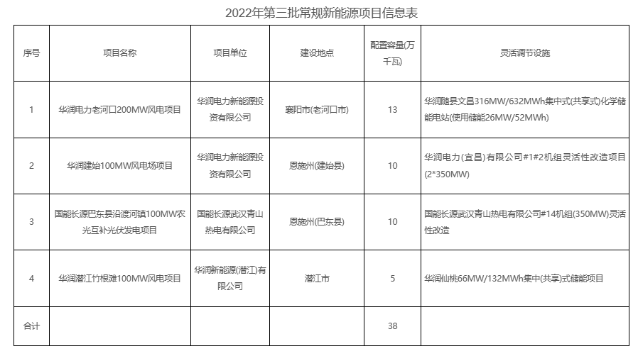 日前,湖北省能源局發(fā)布關于公布2022年第三批新能源發(fā)電項目名單的通知。根據(jù)通知,此次公布的風光火儲新能源百萬千瓦基地(二期)項目共計2個,容量40萬千瓦,均為光伏發(fā)電項目。常規(guī)風電和光伏發(fā)電項目共計4個,容量38萬千瓦。其中:風電項目3個、容量28萬千瓦;光伏發(fā)電項目1個、容量10萬千瓦。通知明確,此次公布的風電項