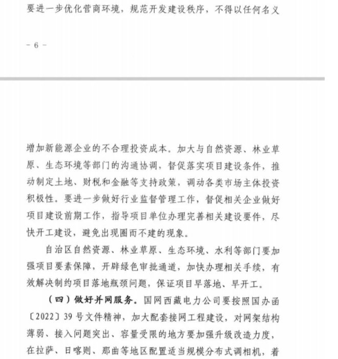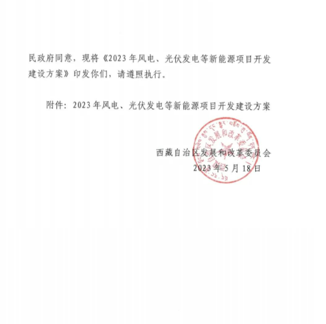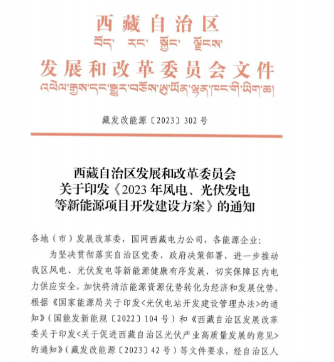 近日,西藏自治區(qū)發(fā)展和改革委員會下發(fā)關于印發(fā)《2023 年⻛電、光伏發(fā)電等新能源項目開發(fā)建設方案》的通知。根據(jù)通知 ,2023年西藏新增風電、光伏發(fā)電等新能源項目建設規(guī)模573. 5萬千瓦。保障性并網(wǎng)項目建設規(guī)模373萬千瓦。包含風電60萬千瓦、光伏278萬千瓦、光熱35萬千瓦,純光伏配置最低儲能規(guī)模144. 4萬千瓦時。