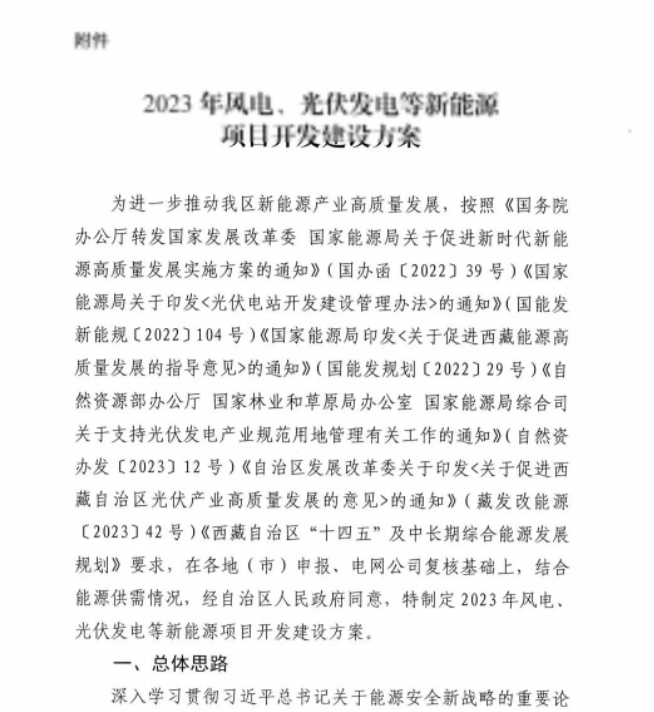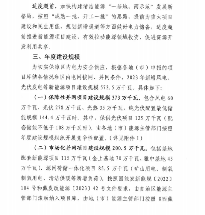 近日,西藏自治區(qū)發(fā)展和改革委員會下發(fā)關于印發(fā)《2023 年⻛電、光伏發(fā)電等新能源項目開發(fā)建設方案》的通知。根據(jù)通知 ,2023年西藏新增風電、光伏發(fā)電等新能源項目建設規(guī)模573. 5萬千瓦。保障性并網(wǎng)項目建設規(guī)模373萬千瓦。包含風電60萬千瓦、光伏278萬千瓦、光熱35萬千瓦,純光伏配置最低儲能規(guī)模144. 4