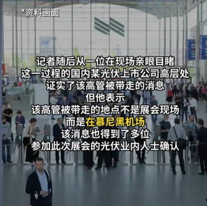 該消息也得到了多位參加此次展會的光伏業(yè)內(nèi)人士確認(rèn)。記者另從一位消息人士處了解到,這次被帶走的不止一人,其中不少都是在航班降落慕尼黑機(jī)場后就被帶走的。