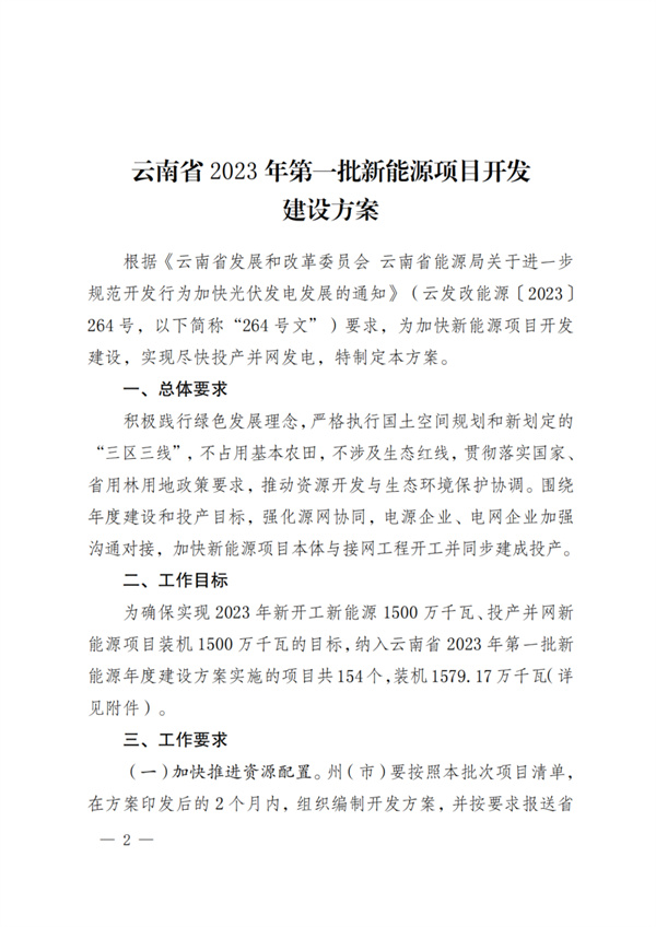 6月13日,云南發(fā)改委、能源局聯(lián)合印發(fā)《云南省2023年第一批新能源建設(shè)方案》。方案明確,為確保實(shí)現(xiàn)2023年新開工新能源1500萬千瓦、投產(chǎn)并網(wǎng)新能源項(xiàng)目裝機(jī)1500萬千瓦的目標(biāo),納入云南省2023年第一批新能源年度建設(shè)方案實(shí)施的項(xiàng)目共154個(gè),裝機(jī)1579.17萬千瓦。