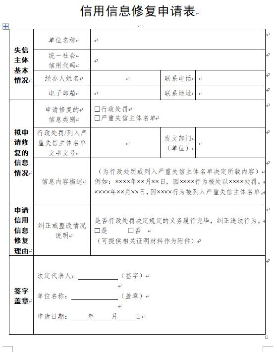 失信信息認(rèn)定單位應(yīng)填寫《信用信息修復(fù)意見書》,上傳信用信息系統(tǒng)網(wǎng)站。