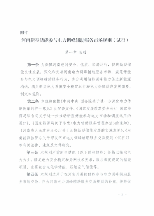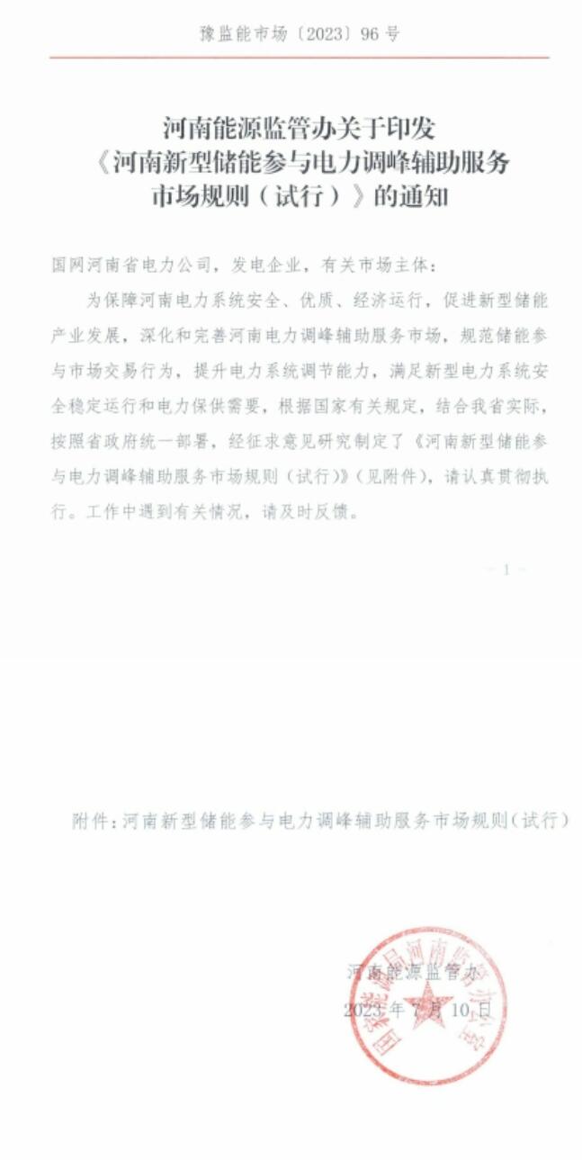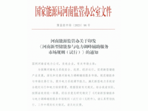 7月18日,河南能源監(jiān)管辦 印發(fā)《河南新型儲(chǔ)能參與電力調(diào)峰輔助服務(wù)市場(chǎng)規(guī)則(試行)》的通知,即日起施行。