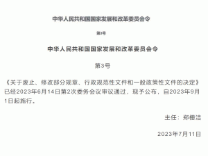 7月21日,國家發(fā)改委發(fā)布2023年3號令!蛾P(guān)于廢止、修改部分規(guī)章、行政規(guī)范性文件和一般政策性文件的決定》已經(jīng)2023年6月14日第2次委務(wù)會議審議通過,現(xiàn)予公布,自2023年9月1日起施行。