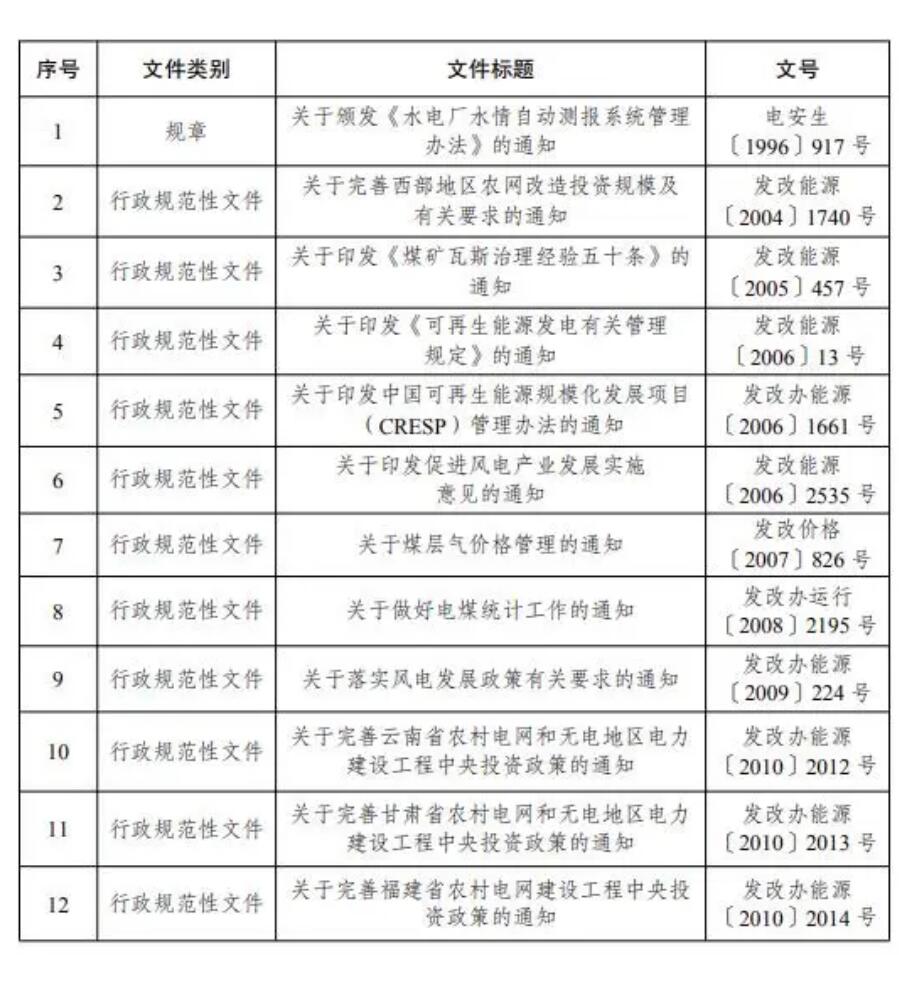 經(jīng)過清理,決定對47件規(guī)章、行政規(guī)范性和一般政策性文件予以廢止,其中包括《關(guān)于頒發(fā)〈水電廠水情自動測報(bào)系統(tǒng)管理辦法〉 的通知》(電安生〔1996〕917號)等多項(xiàng)跟能源有關(guān)文件。