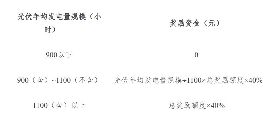 (一)對除戶用光伏以外的常規(guī)光伏項目,根據(jù)并網(wǎng)規(guī)模對項目投資主體給予獎勵,并分兩次發(fā)放。第一次在項目并網(wǎng)投運后予以發(fā)放,發(fā)放資金為總獎勵額度的60%;第二次在項目持續(xù)運行滿2年后(自項目并網(wǎng)日期起算),根據(jù)持續(xù)運行2年的光伏年均發(fā)電量規(guī)模(年均發(fā)電量/光伏裝機(jī)規(guī)模)進(jìn)行發(fā)放,發(fā)放標(biāo)準(zhǔn)如下:
