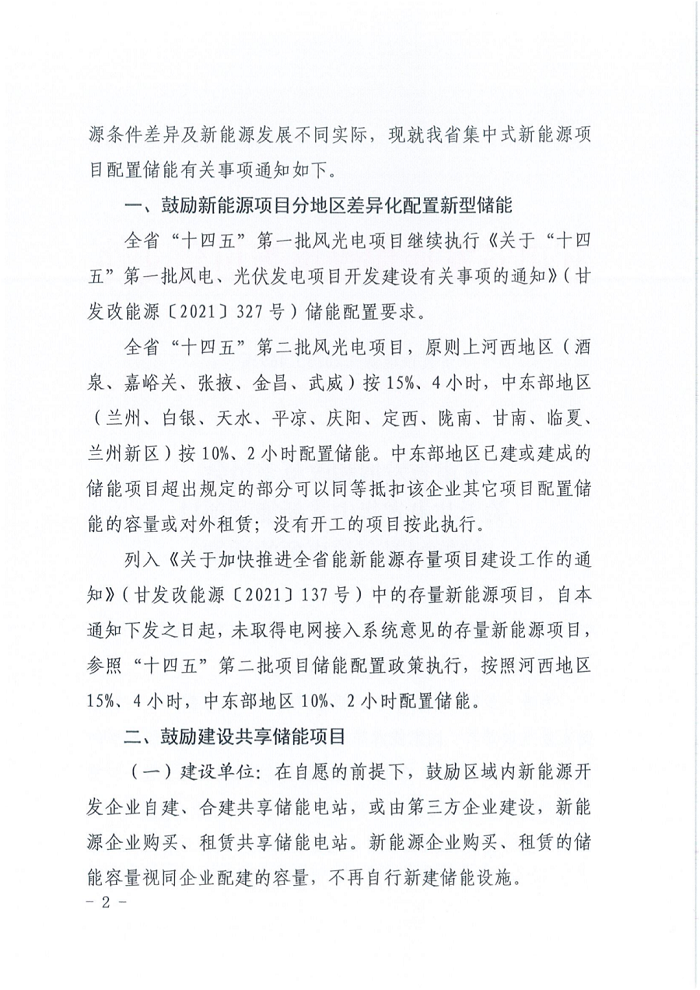 全省“十四五”第一批風光電項目繼續(xù)按照之前的儲能配置要求執(zhí)行。“十四五”第二批風光電項目,原則上河西地區(qū)(酒泉、嘉峪關(guān)、張掖、金昌、武威)按15%、4小時,中東部地區(qū)(蘭州、白銀、天水、平?jīng)、慶陽、定西、隴南、甘南、臨夏、蘭州新區(qū))按10%、2小時配置儲能。