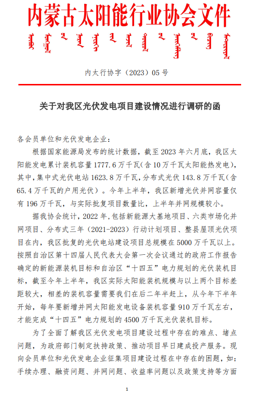 8月17日,內(nèi)蒙古太陽(yáng)能行業(yè)協(xié)會(huì)發(fā)布《關(guān)于對(duì)我區(qū)光伏發(fā)電項(xiàng)目建設(shè)情況進(jìn)行調(diào)研的函》。