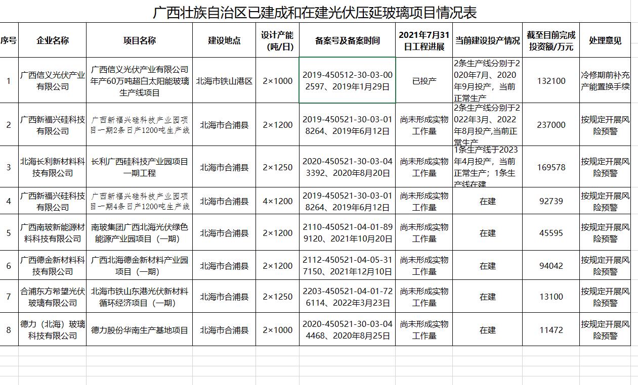 廣西壯族自治區(qū)已建成和在建光伏壓延玻璃項目情況表如下: