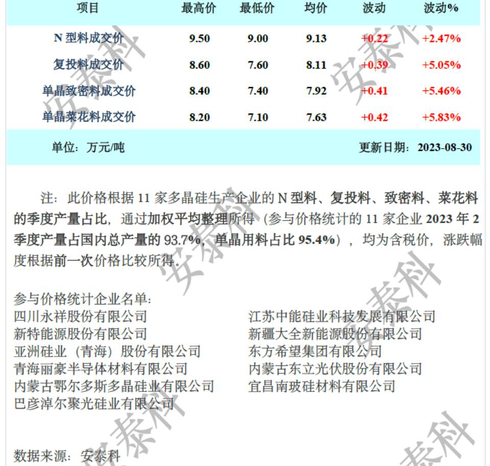 截止本周,國(guó)內(nèi)硅料生產(chǎn)企業(yè)合計(jì)15家(包含新建投產(chǎn)企業(yè)一家),其中1家停產(chǎn)技改,預(yù)計(jì)9月末恢復(fù)少量產(chǎn)出。8月份多晶硅產(chǎn)量合計(jì)約11.64萬(wàn)噸,環(huán)比增加0.69%。1-8月份國(guó)內(nèi)多晶硅產(chǎn)量共計(jì)88.37萬(wàn)噸,同比增長(zhǎng)91.69%。預(yù)計(jì)9月多晶硅產(chǎn)量可達(dá)13.54萬(wàn)噸,環(huán)比增幅在16%左右。短期內(nèi),包括準(zhǔn)東新特、新疆晶諾、鄂爾多斯等企業(yè)有增量釋放的投產(chǎn)產(chǎn)能,寶豐、合盛、上機(jī)、東立等新增投產(chǎn)企業(yè)有望有少量供應(yīng)投放。預(yù)期10月份多晶硅產(chǎn)量15萬(wàn)噸,增幅約10%。新增產(chǎn)能將陸續(xù)釋放,有望在10月份逐步改善市場(chǎng)供需。綜上,短期內(nèi)硅料市場(chǎng)供需仍將保持不平衡狀態(tài),硅料價(jià)格仍將持續(xù)微漲,預(yù)計(jì)10月份硅料供應(yīng)會(huì)有所好轉(zhuǎn)。