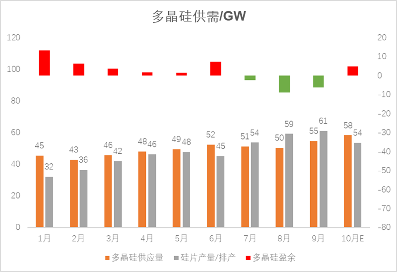 產能過剩的危機已“瀕臨城下”。多晶硅上半年供過于求,高庫存低周轉使二季度價格暴跌至成本線附近。相比于多晶硅,處于中間環(huán)節(jié)的硅片面臨的市場環(huán)境更為復雜,7月以來硅片維持較高的開工率,庫存持續(xù)堆積,有消息顯示9月底庫存達到20億片,疊加甩貨因素,預計10月底硅片價格正式開始下行通道。