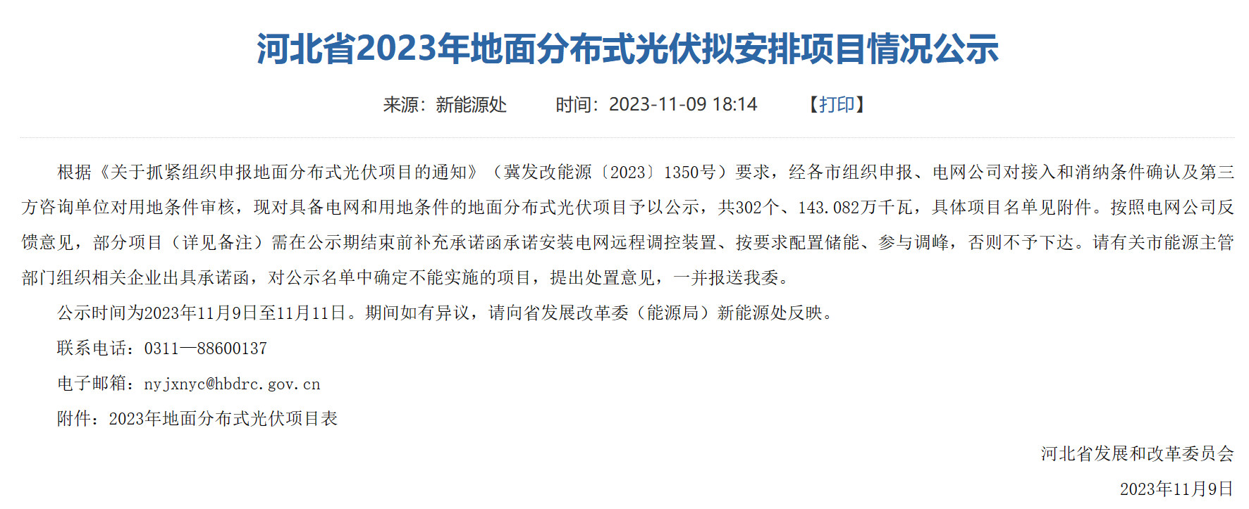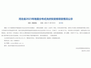 11月9日,河北省發(fā)改委發(fā)布河北省2023年地面分布式光伏擬安排項(xiàng)目情況公示,共302個(gè)、143.082萬(wàn)千瓦。