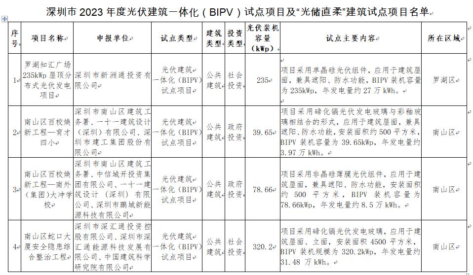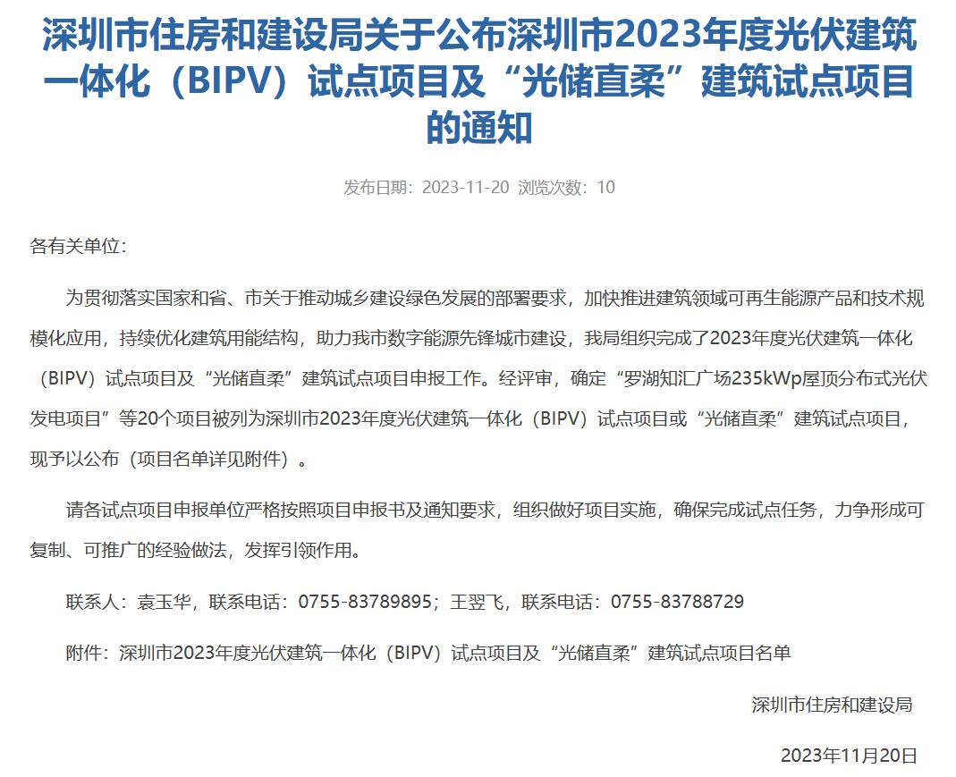 11月20日,深圳市住建局公布了2023年度光伏建筑一體化(BIPV)試點(diǎn)項(xiàng)目及“光儲直柔”建筑試點(diǎn)項(xiàng)目名單,經(jīng)評審,確定“羅湖知匯廣場235kWp屋頂分布式光伏發(fā)電項(xiàng)目”等20個項(xiàng)目被列為深圳市2023年度光伏建筑一體化(BIPV)試點(diǎn)項(xiàng)目或“光儲直柔”建筑試點(diǎn)項(xiàng)目,總裝機(jī)容量14.270435MW。
