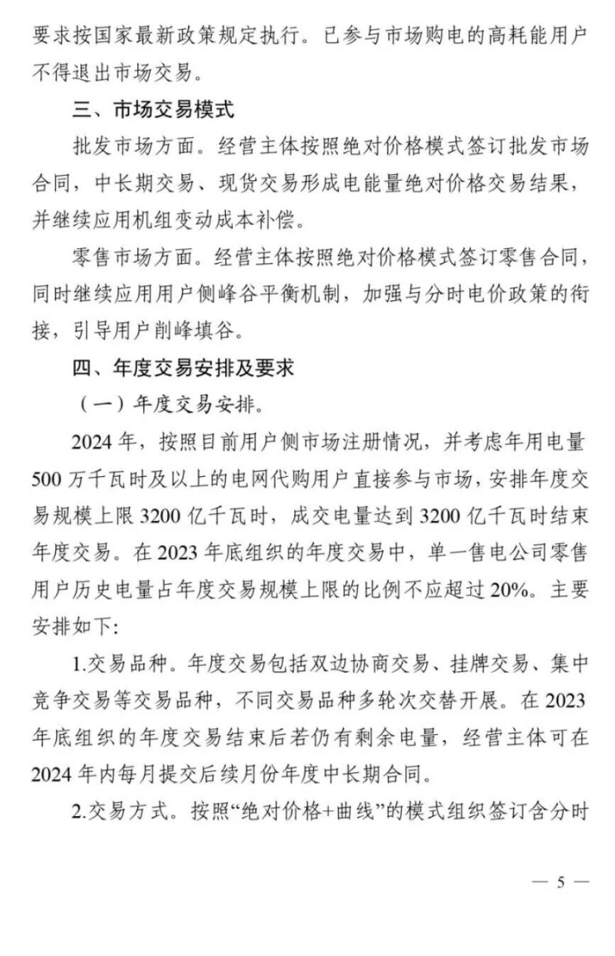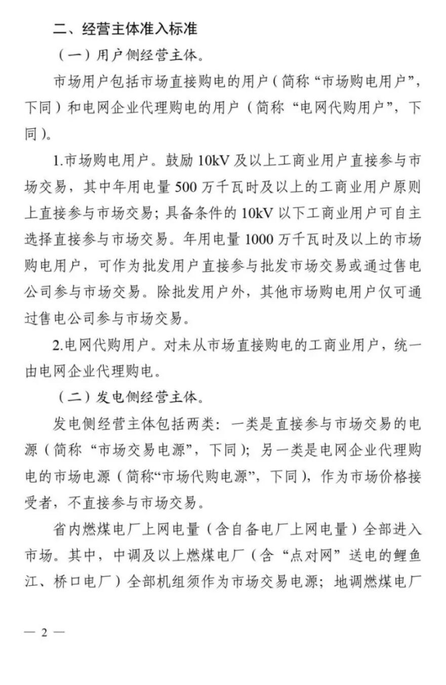 用戶市場(chǎng)主體:10kV及以上電壓等級(jí)用戶可以直接參與市場(chǎng),其中年用電量500萬(wàn)千瓦時(shí)及以上的工商業(yè)用戶原則上直接參與市場(chǎng)交易,未及時(shí)與售電公司簽訂2024年零售合同或參與批發(fā)市場(chǎng)交易的,視同市場(chǎng)購(gòu)電用戶,按照電力市場(chǎng)保底售電有關(guān)規(guī)定,通過(guò)保底售電公司購(gòu)電,執(zhí)行保底零售價(jià)格,并承擔(dān)市場(chǎng)分?jǐn)傎M(fèi)用。