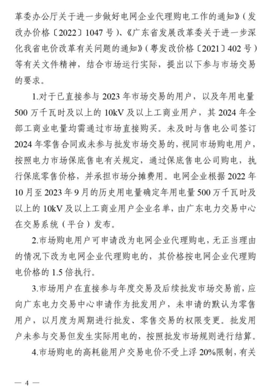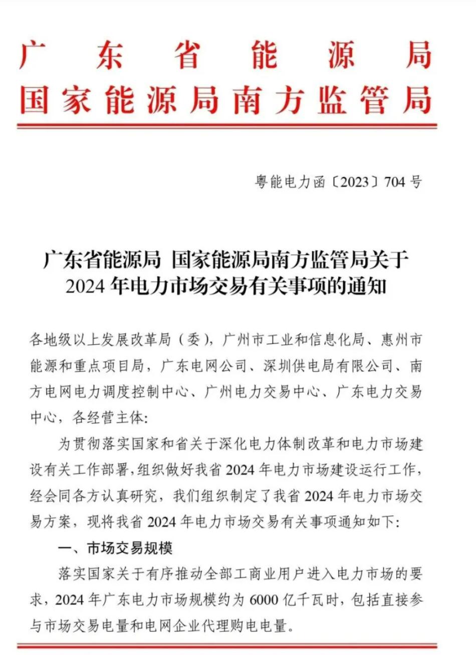 日前,廣東省能源局、國(guó)家能源局南方監(jiān)管局聯(lián)合發(fā)布了《關(guān)于2024年電力市場(chǎng)交易有關(guān)事項(xiàng)的通知》明確,2024年廣東電力市場(chǎng)規(guī)模約為6000億千瓦時(shí),與2023年5500億千瓦時(shí)的市場(chǎng)規(guī)模相比,增加了500億千瓦時(shí)。